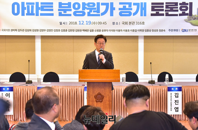 이재명 경기도지사가 19일 오전 국회에서 열린 '아파트 분양원가 공개 토론회'에 참석해 인사말을 하고 있다.