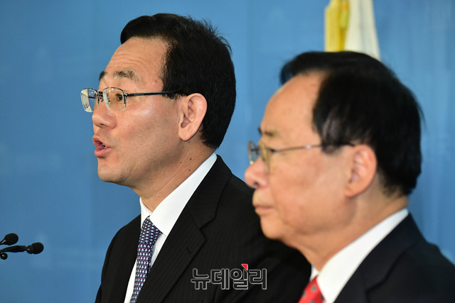 주호영 자유한국당 의원과 이주영 의원이 19일 오후 국회 정론관에서 '사법난국 규탄' 기자회견을 하고 있다.