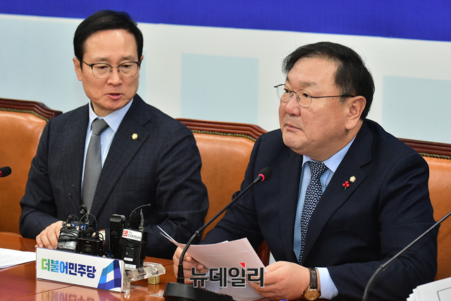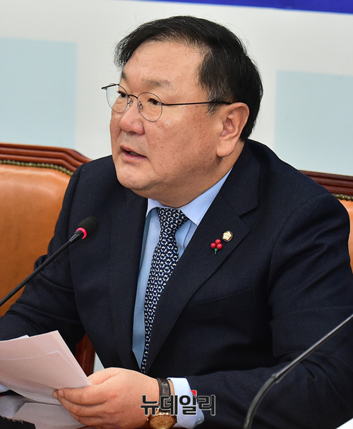 김태년 더불어민주당 정책위의장이 20일 오전 국회에서 열린 정책조정회의에서 모두발언을 하고 있다.