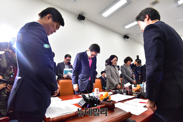 조승래 국회 교육위원회 법안심사소위원장 등 여야 의원들이 20일 오전 국회에서 열린 교육위 법안소위에서 강릉 펜션 사고로 사망한 학생들을 애도하는 묵념을 하고 있다.