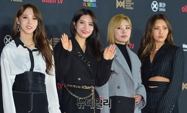 걸그룹 마마무가 20일 오후 경기 고양시 일산 킨텍스에서 열린 '2018 대한민국대중음악시상식(2018 KOREA POPULAR MUSIC AWARDS_이하 2018 KPMA)'에 앞서 열린 레드카펫 행사에서 포토타임을 갖고 있다.'2018 KPMA'는 KT와 대한민국 주요 음악단체가 공동으로 개최하는 대중음악 시상식. 프로듀서 겸 작곡가 김형석이 심사위원장을, 평창동계올림픽의 개∙폐회식 감독을 역임한 송승환이 자문위원을 맡았다.시상은 일반 부문, 장르 부문, 전문가 부문, 특별상 부문, 기술 부문 등이다. (경기 고양=뉴데일리 박성원 기자)
