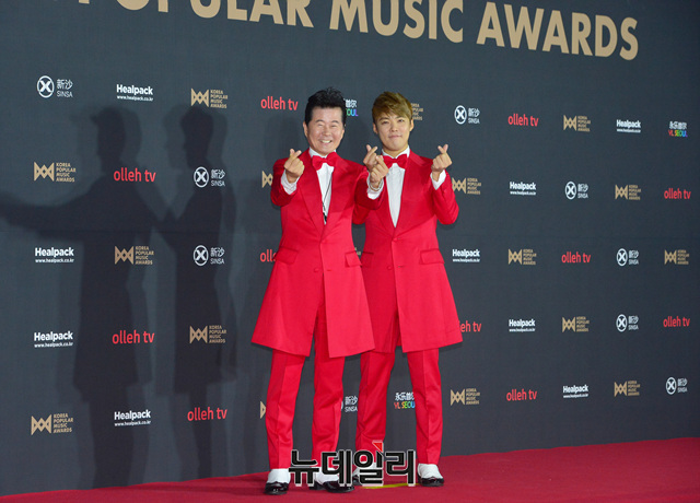 가수 태진아와 강남이 20일 오후 경기 고양시 일산 킨텍스에서 열린 '2018 대한민국대중음악시상식(2018 KOREA POPULAR MUSIC AWARDS, 이하 2018 KPMA)'에 앞서 열린 레드카펫 행사에서 포토타임을 갖고 있다.'2018 KPMA'는 KT와 대한민국 주요 음악단체가 공동으로 개최하는 대중음악 시상식. 프로듀서 겸 작곡가 김형석이 심사위원장을, 평창동계올림픽의 개∙폐회식 감독을 역임한 송승환이 자문위원을 맡았다. 사회는 슈퍼주니어 이특과 배우 진세연이 공동으로 맡았다.시상은 일반 부문, 장르 부문, 전문가 부문, 특별상 부문, 기술 부문 등이다. (경기 고양=뉴데일리 박성원 기자)