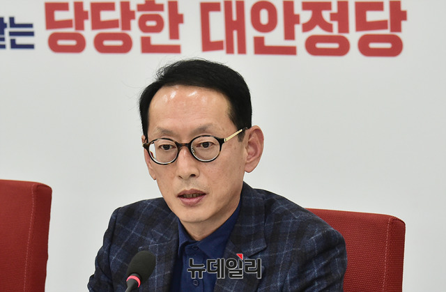김도읍 자유한국당 청와대 특별감찰반 정권실세 사찰보고 및 불법사찰 의혹 진상조사단 단장이 21일 오전 국회에서 열린 회의에서 모두발언을 하고 있다.