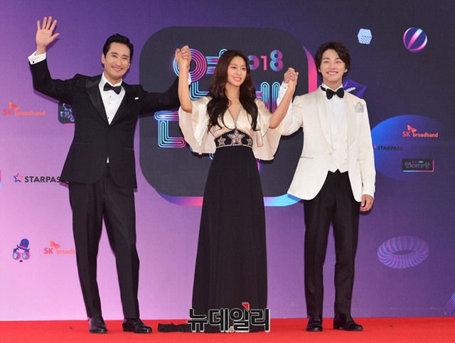 신현준, 설현, 윤시윤이 22일 오후 서울 영등포구 KBS 본관에서 열린 '2018 KBS 연예대상' 시상식에 앞서 포토타임을 갖고 있다. 신현준, 설현, 윤시윤은 이날 시상식 사회를 맡았다.