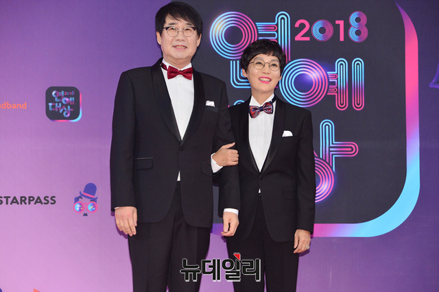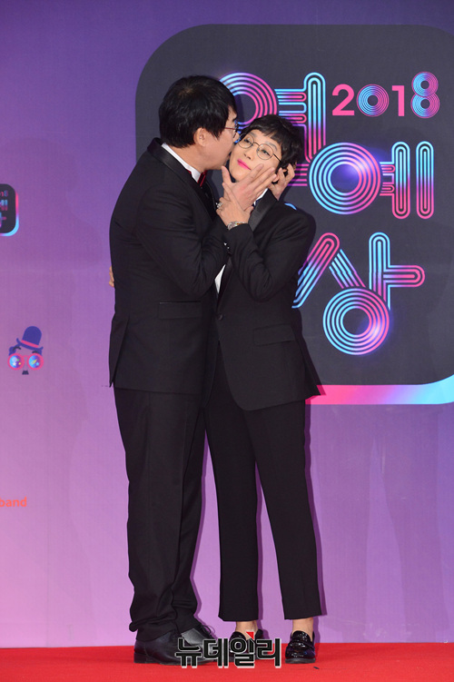 최양락과 팽현숙이 22일 오후 서울 여의도 KBS 본관에서 열린 '2018 KBS 연예대상' 레드카펫 행사에 참석해 포즈를 취하고 있다. 팽현숙은 이날 베스트 엔터테이너상을 수상했다.