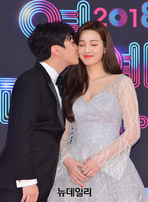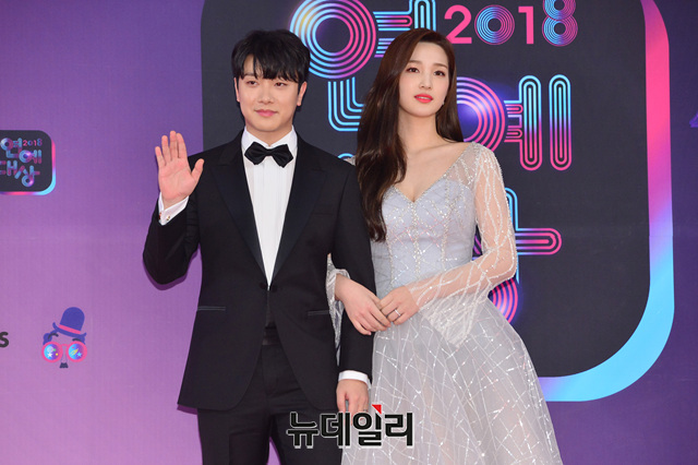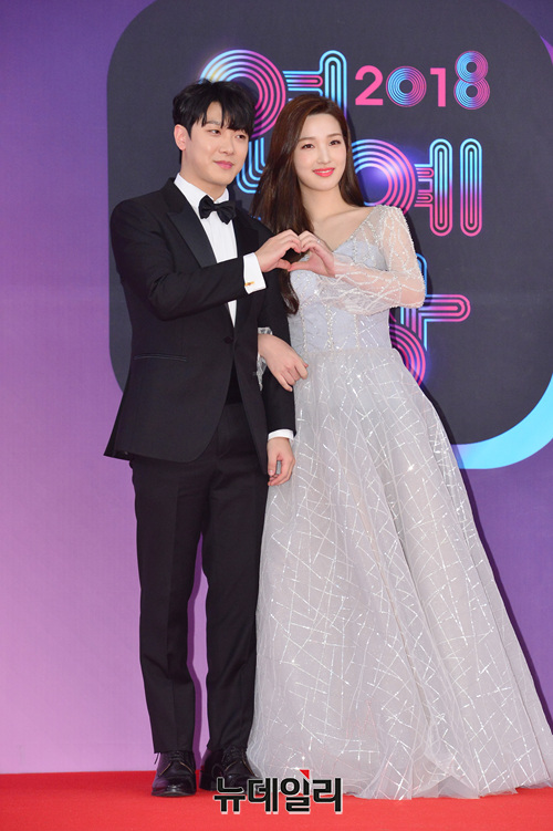 최민환과 율희가 22일 오후 서울 여의도 KBS 본관에서 열린 '2018 KBS 연예대상' 레드카펫 행사에 참석해 포즈를 취하고 있다.