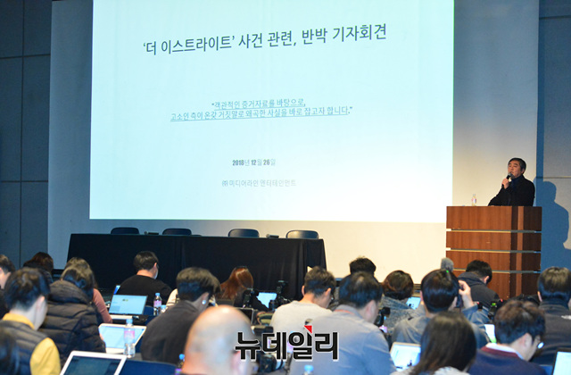 이정현 미디어라인엔터테인먼트 대표가 26일 오후 서울 강남구 섬유센터빌딩에서 열린 '더 이스트라이트' 사건 관련 기자회견에서 질문에 답하고 있다.