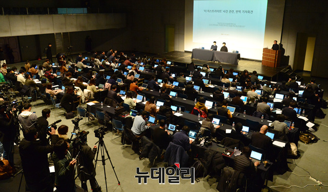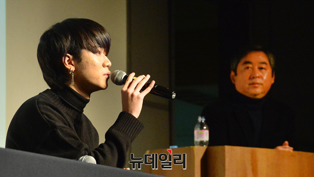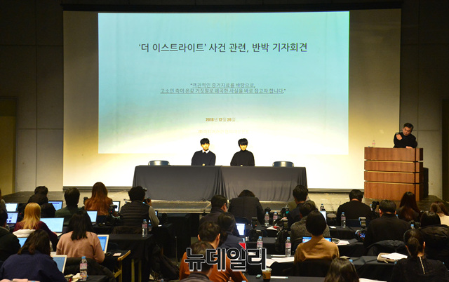 6인조 남성 밴드 '더 이스트라이트' 전 멤버였던 이은성, 정사강이 26일 오후 서울 강남구 섬유센터빌딩에서 열린 '더 이스트라이트' 폭행사건과 관련한 기자회견에서 질문에 답하고 있다.'더이스트라이트' 폭행사건은 멤버였던 이석철, 이승현 형제가 미디어라인 엔터테인먼트 문영일PD에게 폭행과 협박을 당했다고 폭로하면서 불거졌다. 이날 기자회견에는 김창환 회장, 이정현 대표, 이은성, 정사강 전 멤버가 참석해 이석철, 이승현 형제가 제기한 주장에 대해 반박했다.