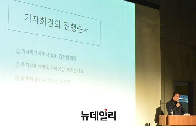 김창환 미디어라인엔터테인먼트 회장이 26일 오후 서울 강남구 섬유센터빌딩에서 '더 이스트라이트' 사건과 관련해 긴급 기자회견을 갖고 있다.