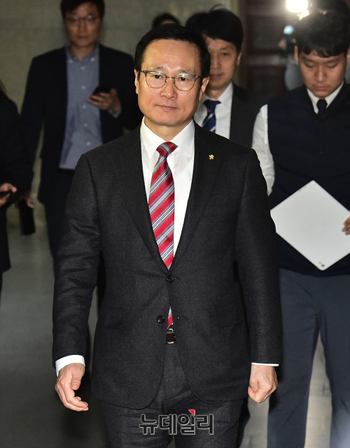 홍영표 더불어민주당 원내대표가 27일 오전 국회 운영위원장실에서 열린 원내대표 회동에 참석하기 위해 입장하고 있다.
