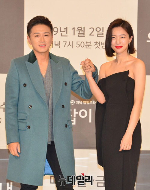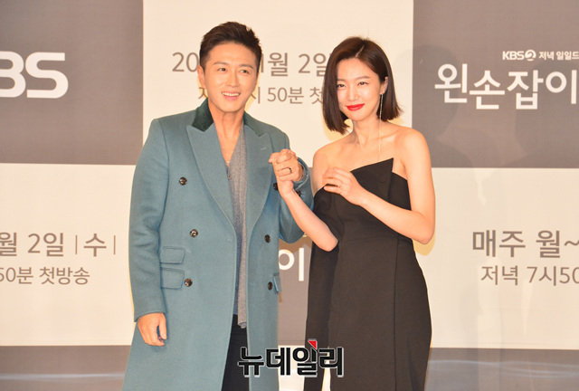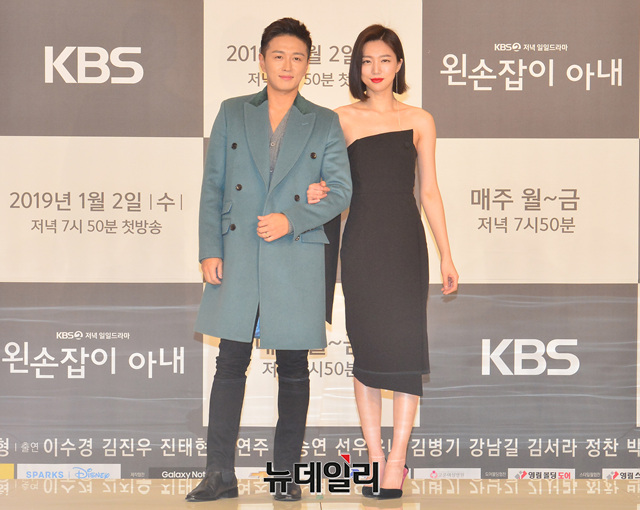 배우 진태현(왼쪽), 하연주가 27일 오후 서울 영등포 타임스퀘어에서 열린 KBS 2TV 새 일일드라마 ‘왼손잡이 아내’ 제작발표회에 참석해 포토타임을 갖고 있다.