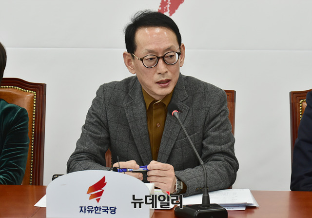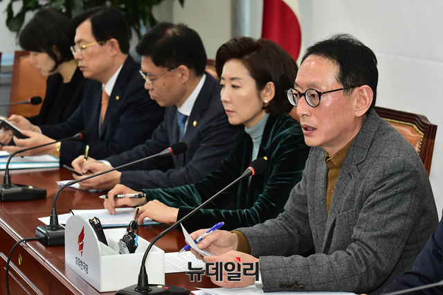 자유한국당 김도읍 청와대 특감반 조사단장이 28일 오전 국회에서 열린 청와대 특별감찰반 정권실세 사찰 보고 묵살 및 불법사찰 의혹 진상조사단 회의에서 모두발언을 하고 있다.