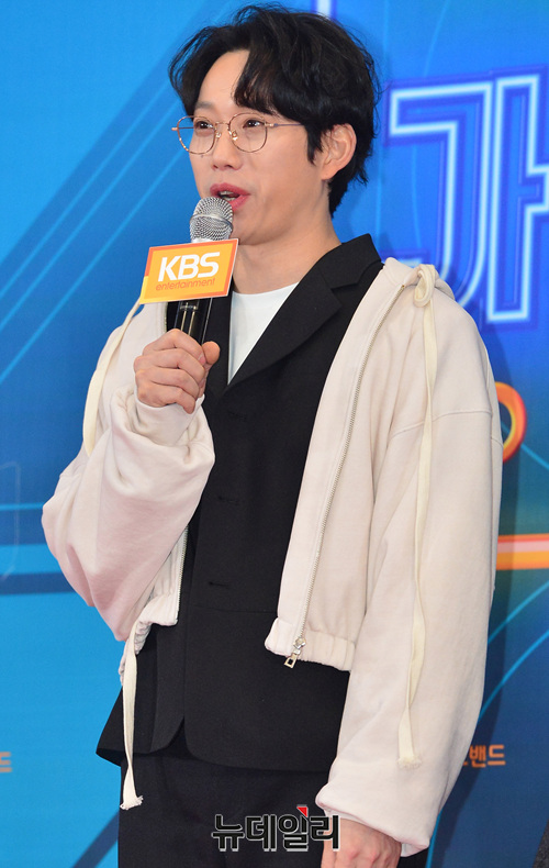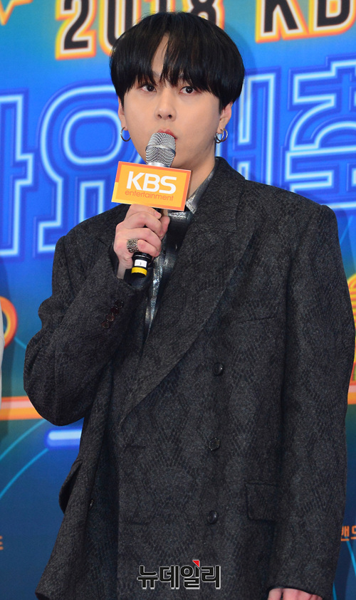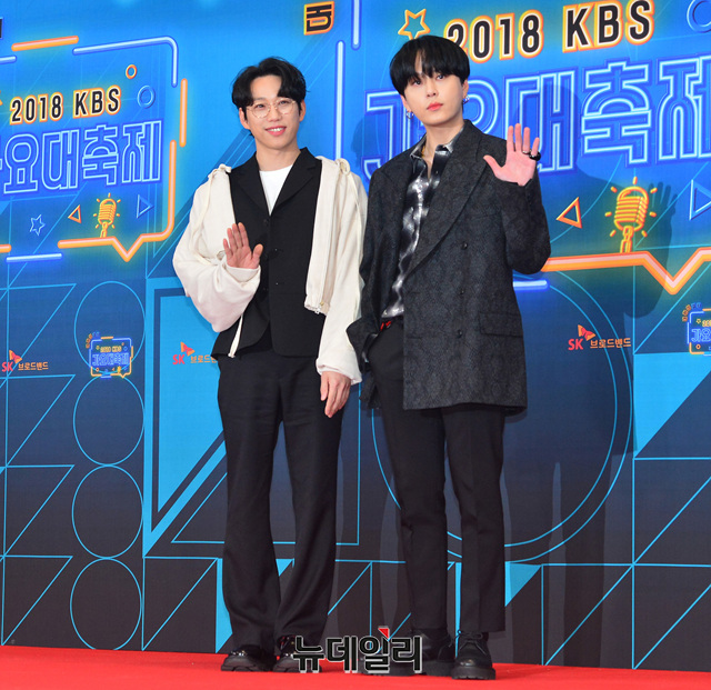 가수 10CM(왼쪽), 용준형이 28일 오후 서울 여의도 KBS 신관 웨딩홀에서 열린 '2018 KBS 가요대축제’에 참석해 포토타임을 갖고 있다