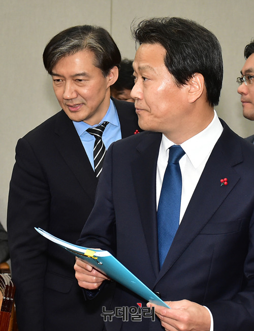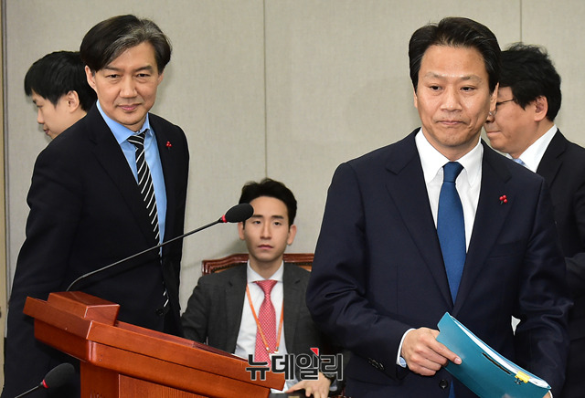 임종석 대통령 비서실장과 조국 민정수석이 31일 오전 국회에서 열린 운영위원회 전체회의에서 참석하기 위해 입장하고 있다.