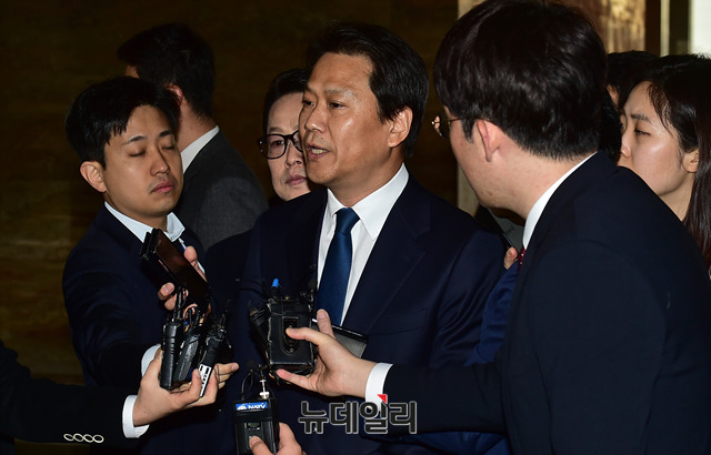임종석 대통령 비서실장이 31일 오전 국회에서 열린 운영위원회 전체회의에 참석하기에 앞서 기자들의 질문에 답하고 있다.