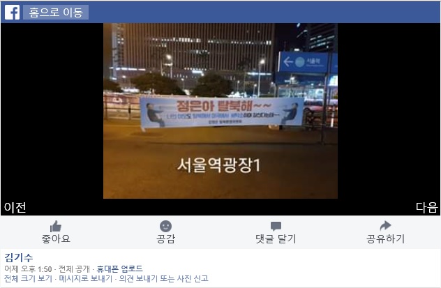 연말, 서울 도심에 '김정은 환영' 플래카드가 여기저기 내걸려 시민들 인상을 찌푸리게 했다. 이번엔 '김정은 탈북 권유' 플래카드다. 세밑, 페이스북에 '정은아 탈북해~~'란 글이 쓰인 플래카드 사진이 빠르게 확산되고 있다.31일 페이스북에는, '김정은 탈북환영위원회' 명의로 서울 도심에 걸린 '정은아 탈북해~~' 플래카드 사진이 여럿 돌아다니고 있다. 최근 서울 도심을 휩쓸던(?) '김정은 답방 환영' 메시지들에 대한 패러디다. SNS 이용자들은, 광화문·서울역광장 등에서 찍은 패러디 플래카드 사진을 연이어 올리고 있다.비무장지대 철책을 넘고 있는 김정은 사진을 배경으로 제작된 이 플래카드에는 '김정은의 이모'도 언급이 돼 있다. '너의 이모도 탈북해서 미국에서 세탁소하며 잘 산다는데~~'란 내용이다. '이모'와 관련, SNS 이용자들은 김정은의 생모 고영희의 여동생 고영숙을 지칭하는 것이라는 '해설'을 남기기도 한다. 고영숙은 2000년을 전후해 미국으로 망명한 것으로 알려져 있다.SNS 이용자들은 '정은아 탈북해~~' 페이스북 포스팅에 '와우~ 촌철살인!!', '인생 세탁할 기회를 주려는 배려심이 돋보이지요?' 등의 댓글을 남겼다.[사진 = 김기수 페이스북 캡처]
