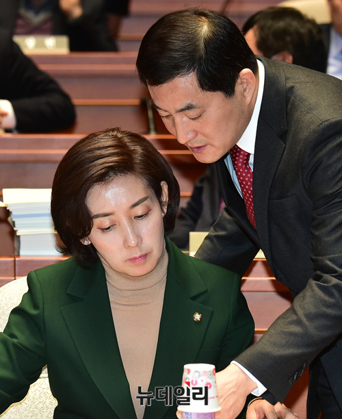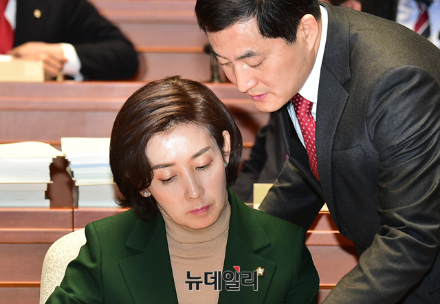 나경원 자유한국당 원내대표가 4일 국회에서 열린 긴급 의원총회에서 박대출 의원과 대화를 나누고 있다.