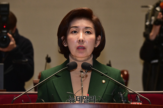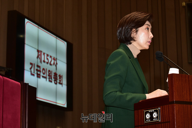나경원 자유한국당 원내대표가 4일 오전 국회에서 열린 긴급 의원총회에서 모두발언을 하고 있다.