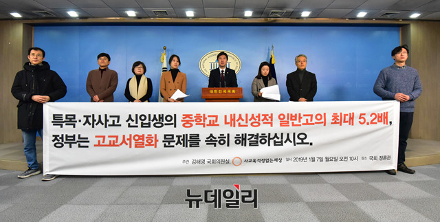 김해영 더불어민주당 의원이 7일 오전 국회 정롱관에서 기자회견을 갖고 서울소재 외고-국제고-자사고 신입생 중학교 내신성적 전수조사 결과 관련 발언을 하고 있다.
