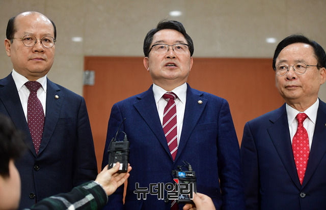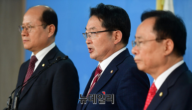 이종명(왼쪽부터), 백승주, 이주영 국회 국방위원회 소속 의원이 7일 오후 국회 정론관에서 기자회견을 열고 '청와대 행정관의 군 인사 개입 문란행위' 진상규명 요구하고 있다.