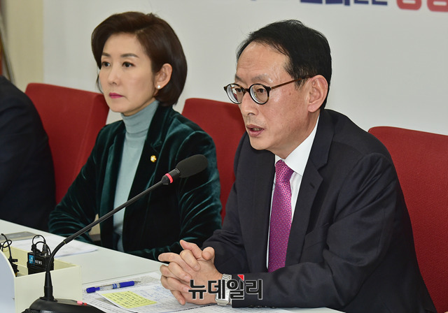 김도읍 자유한국당 청와대 특감반 진상조사단장이 8일 오후 국회에서 열린 사찰조작 위선정권 진상규명 연석회의에서 모두발언을 하고 있다.