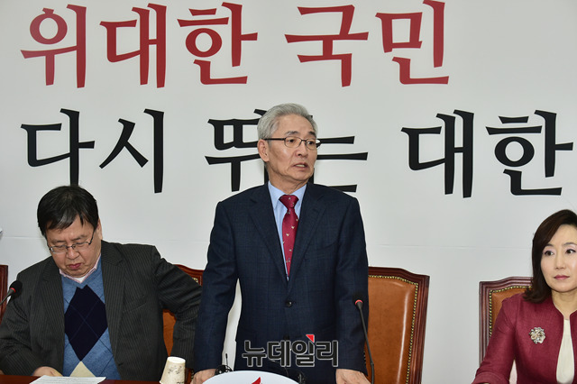 이진곤 자유한국당 조직강화특별위원 8일 오후 국회에서 기자간담회를 갖고 공개오디션을 통해 당협위원장을 결정할 지역과 후보들을 발표에 앞서 관련 발언을 하고 있다.