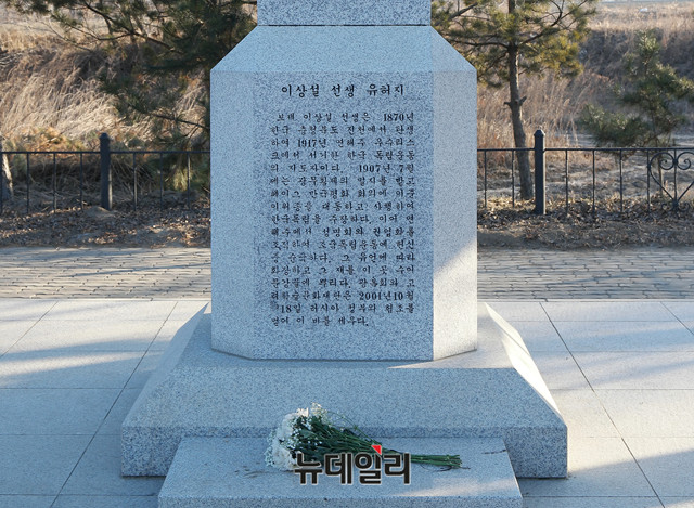 러시아 우스리스크 수이펀(綏芬)강 인근에 세워져 있는 독립운동가 보재(溥齋) 이상설(李相卨, 1870~1917) 선생의 유허비.이 선생은 1904년 일제의 황무지 개척권 요구에 맞서 이를 철회시키고, 1905년 을사조약 체결에 반대해 상소투쟁을 펼쳤다. 이후 만주와 노령으로 망명해 국권회복운동을 전개했다.1907년 광무황제의 특사로 이준, 이위종과 함께 헤이그에 파견돼 한국 독립을 호소했다. 1908년 연해주로 망명해 13도의군 창설과 성명회 결성, 권업회 활동 등을 앞장서서 이끌었다.유해는 인근 수이펀 강에 뿌려졌으며 이후 광복회와 고려학술재단이 2001년 10월 8일 러시아정부의 협조를 얻어 이상설 유허비를 세웠다. (러시아 우수리스크=뉴데일리 이기륭 기자)