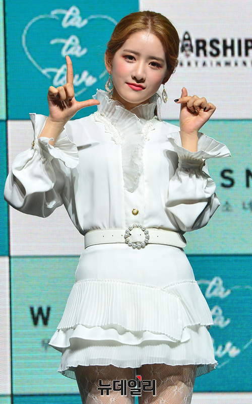 우주소녀 엑시가 8일 오후 서울 광진구 예스24라이브홀에서 'WJ STAY?(우주스테이?)' 발매 기념 컴백 쇼케이스에서 포토타임을 갖고 있다.