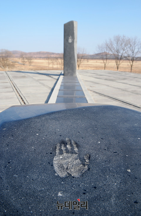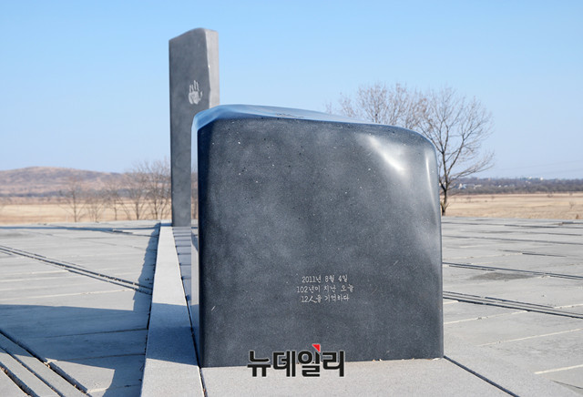 안중근 의사의 손도장이 새겨진 '단지동맹비'. 안 의사를 비롯한 결사동지 12명(김기룡, 강순기, 정원주, 박봉석, 류치홍, 조응순, 황병길, 백규삼, 김백춘, 김천화, 강창두 등)이 조국의 독립을 결의한 것을 기리기 위한 기념비가 러시아 크라스키노에 위치해 있다.지난 2001년 광복회와 고려학술문화재단이 러시아 정부의 협조를 얻어 러시아 크라스키노 외각 쭈까노보에 첫 단지동맹 유허비를 세웠지만 이후 관리 문제로 이전을 거듭하다가 2011년 새로운 기념비와 공원을 조성해 현재의 위치로 옮겼다. (러시아 크라스키노=뉴데일리 이기륭 기자)