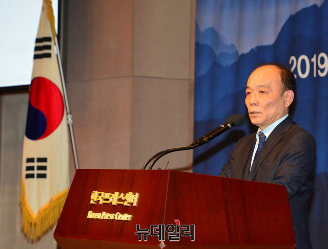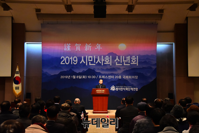 전원책 변호사가 8일 오전 서울 중구 프레스센터에서 '2019 시민사회 합동 신년회'에 참석해 축사를 하고 있다.