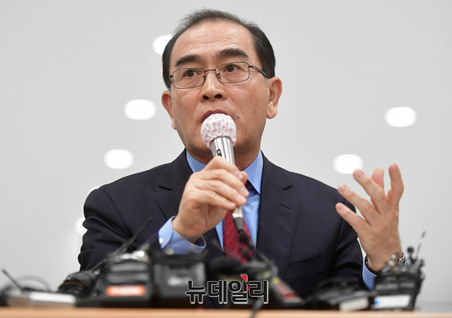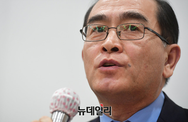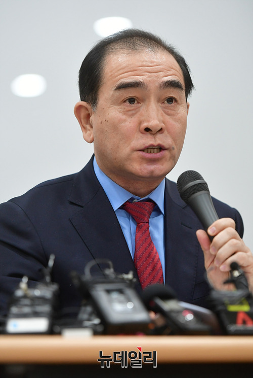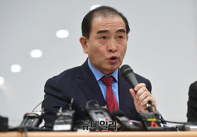 태영호 전 영국 주재 북한 공사가 9일 오전 서울 종로구 센터포인트 광화문빌딩에서 열린 '북한 외교관 조성길 가족 한국행 지지 시민연대' 기자간담회에서 발언하고 있다.시민연대의 상임공동대표는 태영호 전 영국 주재 북한 공사, 김성민 자유북한방송 대표, 박관용 전 국회의장, 정대철 전 민주당 대표가 맡았다.이들은 성명을 통해 △한국정부가 이탈리아 정부에 조성길 가족의 신변안전을 보장하고, 대한민국으로 올 의향 확인 △조성길과 가족이 희망하는 나라로 갈 수 있도록 보장 △안전한 한국행을 이룰 수 있도록 적극 노력 등을 요구했다.