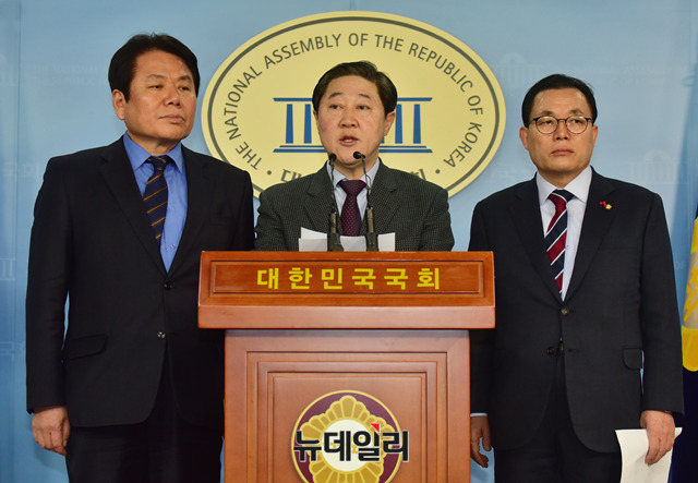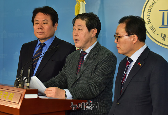 유기준 자유한국당 의원이 9일 오전 국회 정론관에서 북한산 석탄 반입의혹 관련 기자회견을 갖고 있다. (왼쪽부터 정양석 의원, 유 의원, 이채익 의원)
