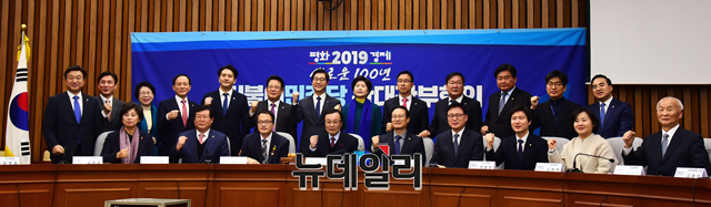 이해찬 더불어민주당 대표, 홍영표 더불어민주당 원내대표 및 의원들이 9일 오전 국회에서 열린 더불어민주당 확대간부회의에서 신년 기념사진을 촬영했다.