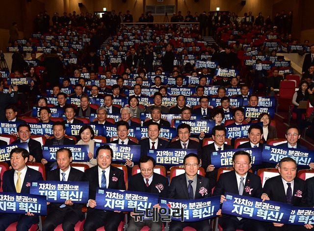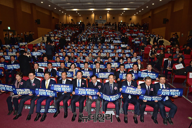 이해찬 더불어민주당 대표, 홍영표 원내대표 등 참석자들이 9일 오후 국회 의원회관에서 열린 더불어민주당 참좋은지방정부위원회 발대식에 참석해 피켓을 들고 있다.