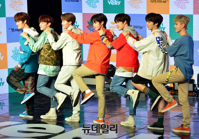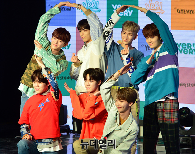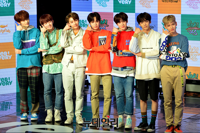 7인조 신인 아이돌그룹 'VERIVERY(베리베리)'가 9일 서울 강남구 일지아트홀에서 열린 데뷔 앨범 'VERI-US(베리어스)' 쇼케이스에서 포토타임을 갖고 있다.