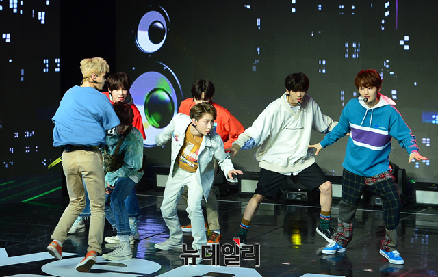 7인조 신인 아이돌그룹 'VERIVERY(베리베리)' 호영이 9일 서울 강남구 일지아트홀에서 열린 데뷔 앨범 'VERI-US(베리어스)' 쇼케이스에서 무대를 선보이고 있다.