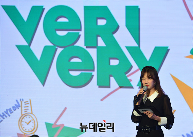 방송인 박소현이 9일 서울 강남구 일지아트홀에서 열린 'VERIVERY(베리베리)'의 데뷔 앨범 'VERI-US(베리어스)' 쇼케이스에서 사회를 보고 있다.
