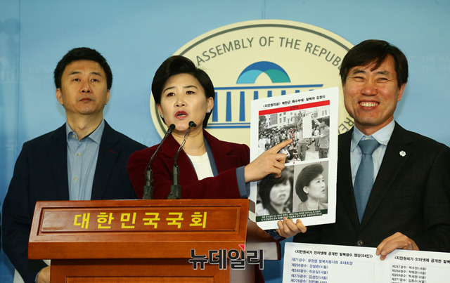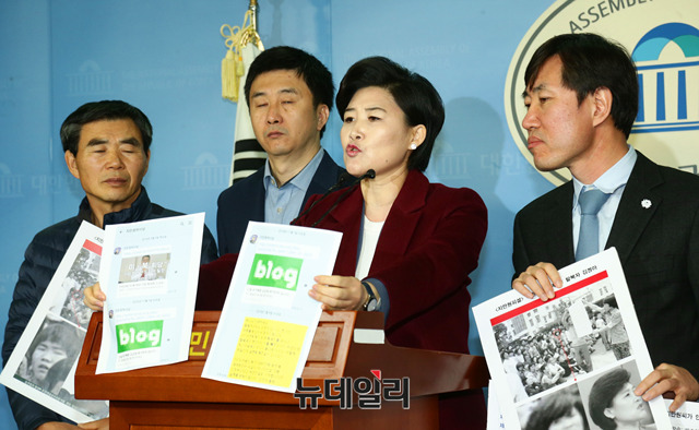 하태경 바른미래당 의원이 10일 오전 국회 정론관에서 지만원씨의 5.18 북한특수부대 개입 주장 관련 피해 탈북자들과 자회견을 하고 있다.