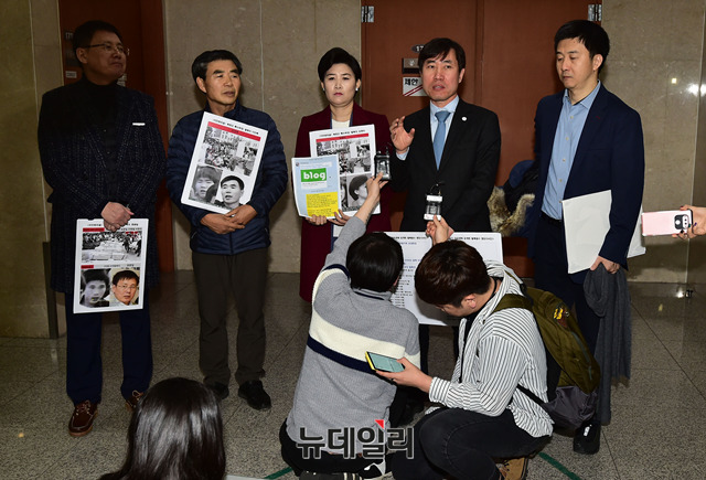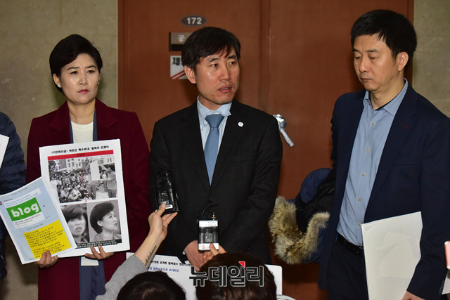 하태경 바른미래당 의원이 10일 오전 국회 정론관에서 지만원씨의 5.18 북한특수부대 개입 주장 관련 피해 탈북자들과 자회견을 마치고 기자들의 질문에 답하고 있다.