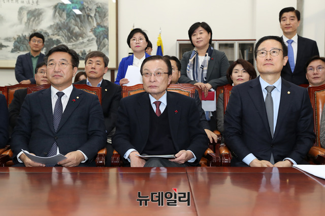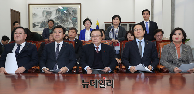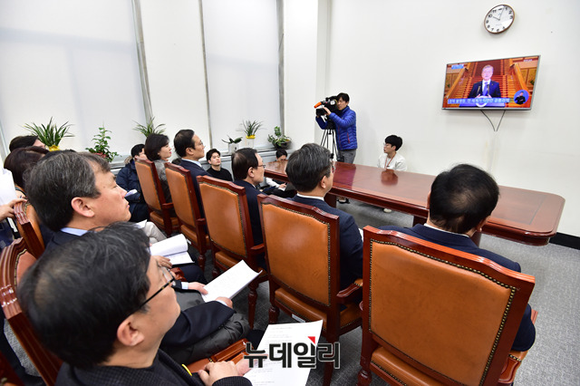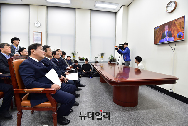 이해찬 더불어민주당 대표와 홍영표 원내대표 등 당 지도부가 10일 오전 국회 당대표실에서 문재인 대통령의 신년기자회견을 시청하고 있다.