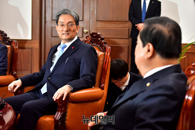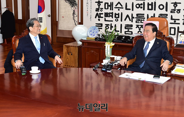 노영민 신임 대통령 비서실장이 10일 오후 국회 의장실을 방문해 문희상 국회의장과 대화를 나누고 있다.