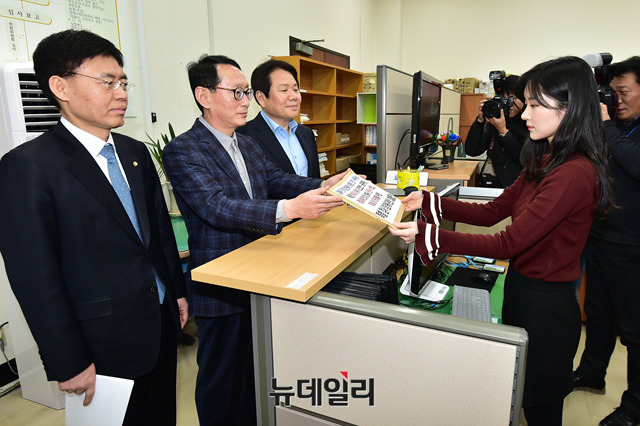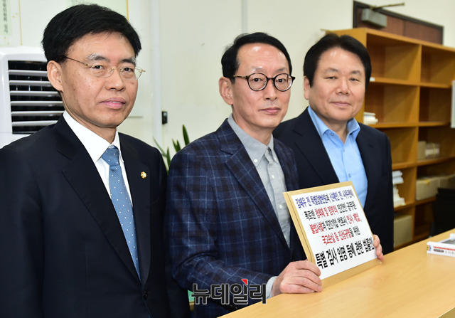 김도읍 자유한국당 청와대 특감반 의혹 진상조사단 단장과 최교일 의원, 정양석 원내수석부대표가 10일 오후 국회 의안과를 찾아 '김태우 전 청와대 특별감찰반 수사관과 신재민 전 기획재정부 사무관이 제기한 의혹에 대한 특별검사법'을 제출하고 있다.