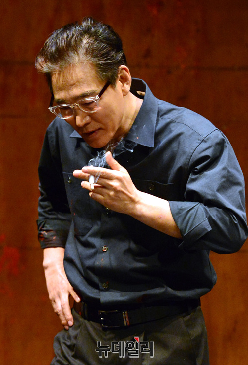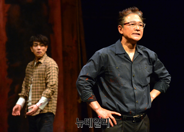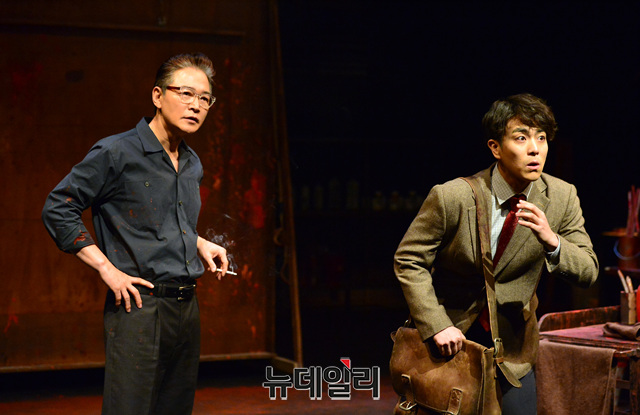 배우 정보석, 박정복이 10일 오후 서울 서초구 예술의전당 자유소극장에서 열린 연극 '레드'의 프레스콜에서 열연하고 있다.
