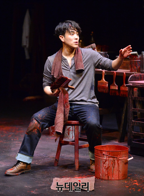 배우 박정복이 10일 오후 서울 서초구 예술의전당 자유소극장에서 열린 연극 '레드' 프레스콜에서 열연하고 있다.