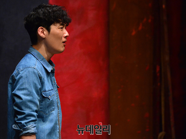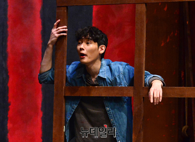 배우 김도빈이 10일 오후 서울 서초구 예술의전당 자유소극장에서 열린 연극 '레드' 프레스콜에서 열연하고 있다.