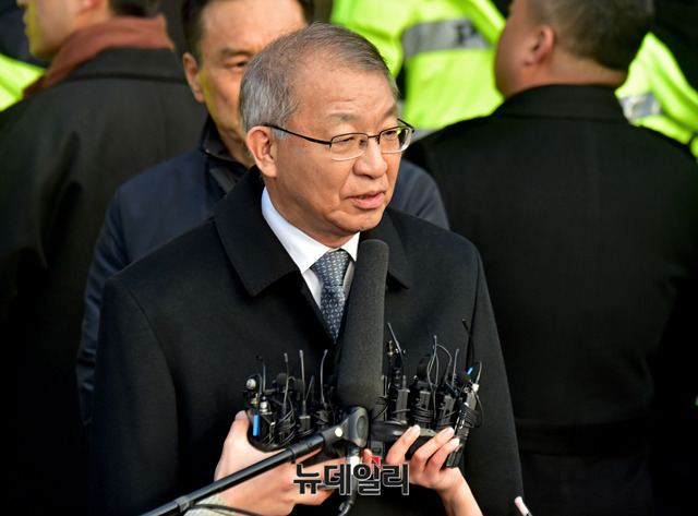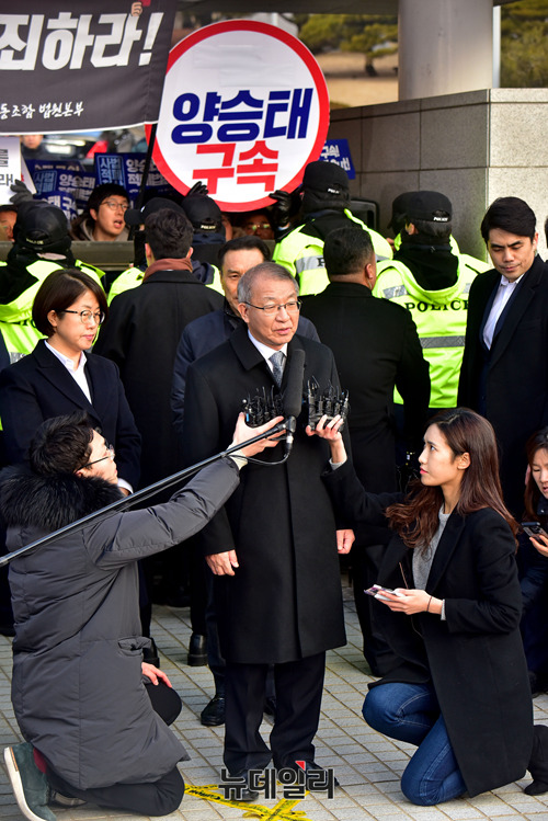 사법농단 의혹을 받고 있는 양승태 전 대법원장이 검찰출석을 앞둔 11일 오전 서울 서초구 대법원 앞에서 기자회견을 갖고 있다.