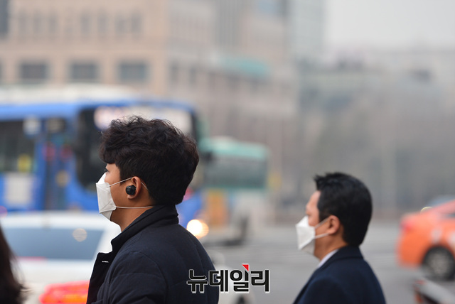 고농도 미세먼지로 비상저감조치가 시행된 14일 오전 서울 여의도 출근길 시민들이 마스크를 쓰고 발걸음을 제촉하고 있다. 이날 서울 미세먼지와 초미세먼지는 '매우 나쁨' 수준을 보이고 있다.