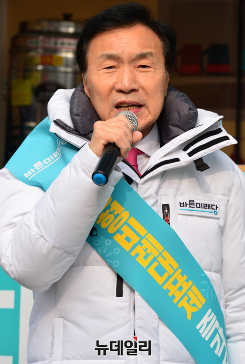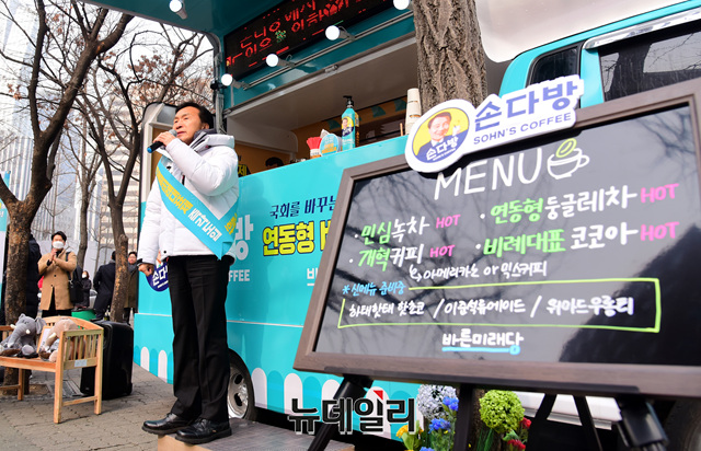 손학규 바른미래당 대표가 14일 오전 서울 영등포구 한국노총 인근에서 연동형 비례대표제 도입을 위한 대국민 홍보캠페인 '손다방에서 만납시다'를 진행하고 있다.