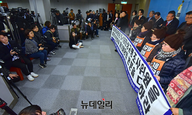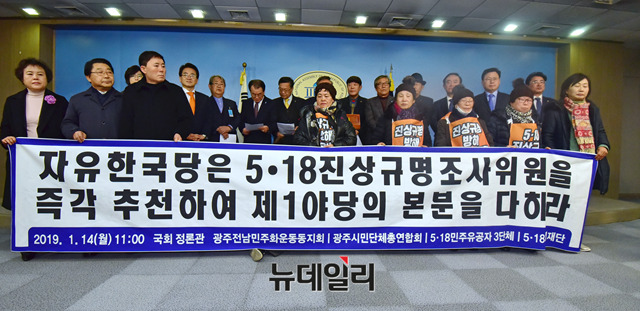 5·18 민주화운동 희생자-부상자 가족들이 14일 오전 국회 정론관에서 기자회견을 갖고 자유한국당 5.18 진상규명 조사위원 추천과 관련 기자회견을 하고 있다.