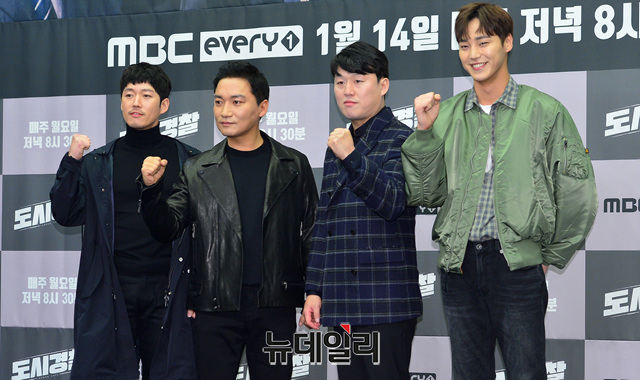 배우 장혁(왼쪽부터), 조재윤, 김민재, 이태환이 14일 오후 서울 마포구 스탠포드호텔에서 열린 MBC에브리원 '도시경찰' 제작발표회에 참석해 포토타임을 갖고 있다.